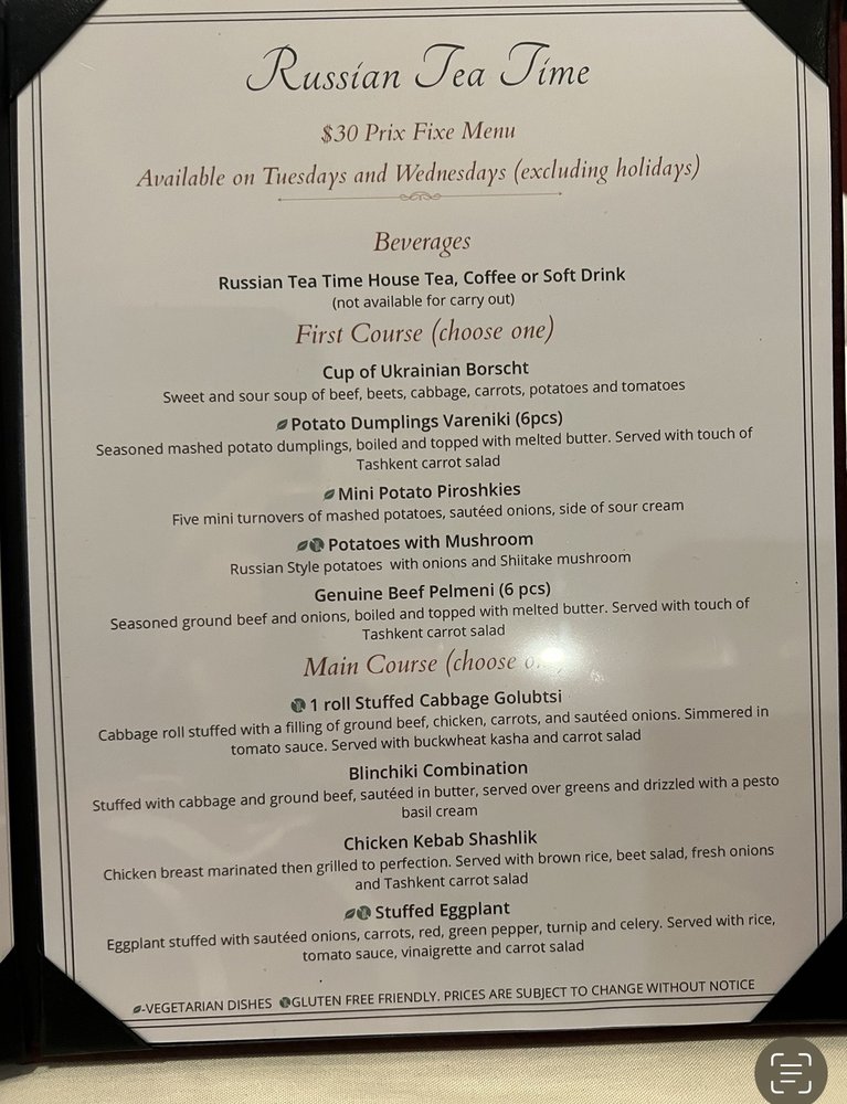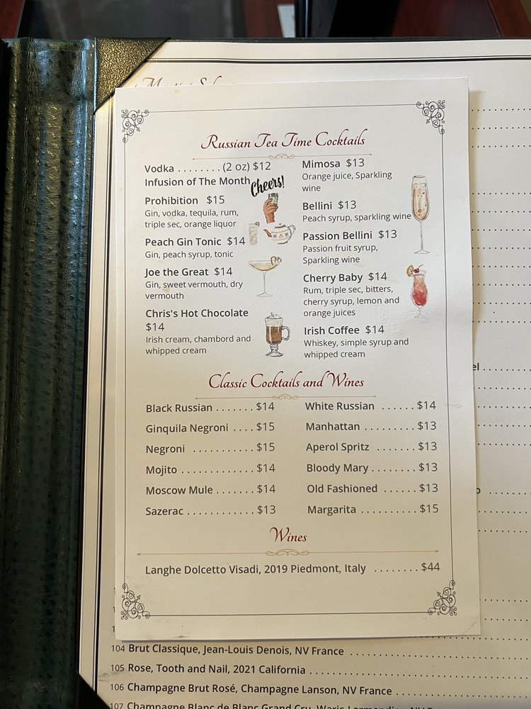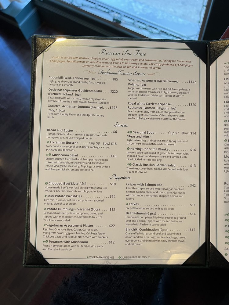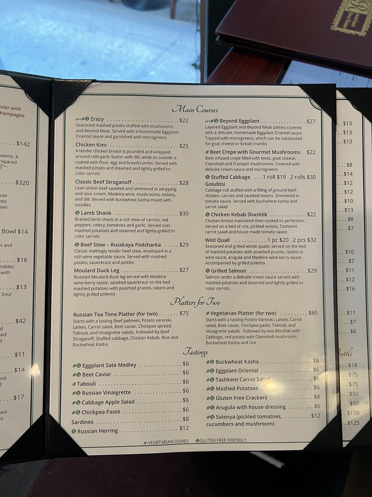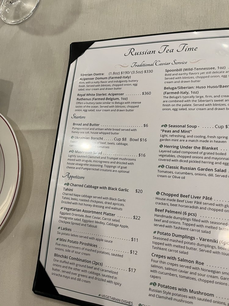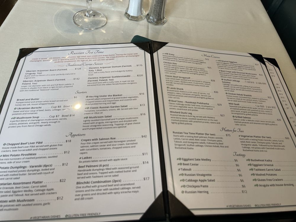 Russian Tea Time, a modern European-Russian restaurant in Chicago, offers a diverse menu with vegan options and limited vegetarian choices. This classy establishment is wheelchair accessible and accepts various payment methods, including cryptocurrency. The restaurant boasts a full bar, happy hour specials, and offers catering services. With a women-owned status and commitment to sustainability, Russian Tea Time provides reusable tableware and compostable containers. The menu features traditional Russian dishes with a modern twist, perfect for groups, dinner outings, and special occasions. The restaurant's cozy atmosphere, attentive service, and flavorful dishes make it a delightful dining experience. From borscht to blinis, each dish is prepared with care and showcases the rich flavors of Russian cuisine. Don't miss out on the unique culinary experience at Russian Tea Time.