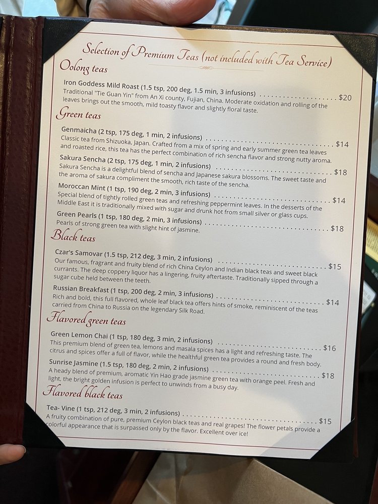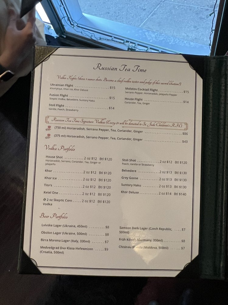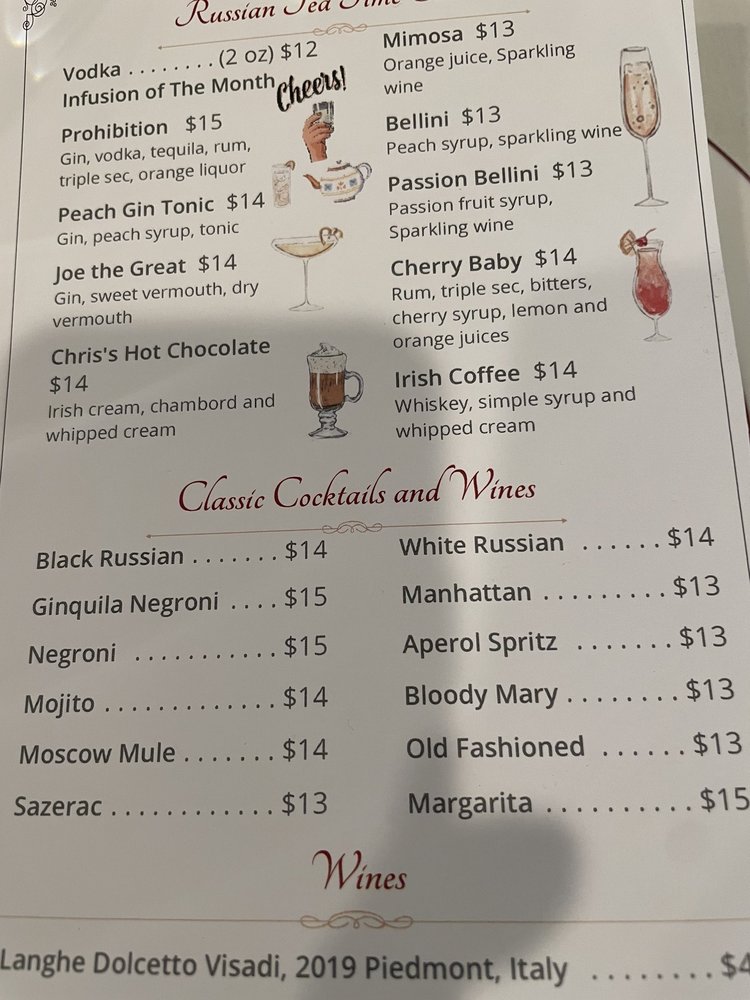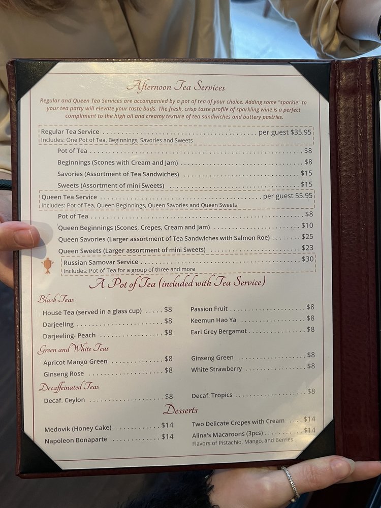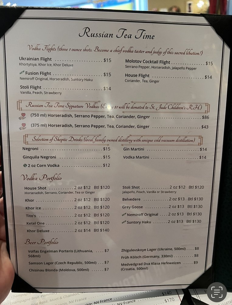 Russian Tea Time, a modern European-Russian restaurant in Chicago, offers a diverse menu with vegan options and limited vegetarian choices. This classy establishment is wheelchair accessible and accepts various payment methods, including cryptocurrency. The restaurant boasts a full bar, happy hour specials, and offers catering services. With a women-owned status and commitment to sustainability, Russian Tea Time provides reusable tableware and compostable containers. The menu features traditional Russian dishes with a modern twist, perfect for groups, dinner outings, and special occasions. The restaurant's cozy atmosphere, attentive service, and flavorful dishes make it a delightful dining experience. From borscht to blinis, each dish is prepared with care and showcases the rich flavors of Russian cuisine. Don't miss out on the unique culinary experience at Russian Tea Time.